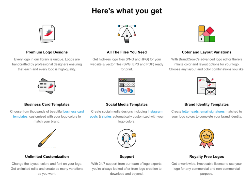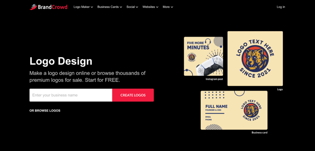 BrandCrowd’s free plan is remarkably generous. You get free logos in all major file formats with no watermarks or hidden fees. The free plan also includes a website builder, digital business card, and link-in-bio tool to help you establish your complete online presence.