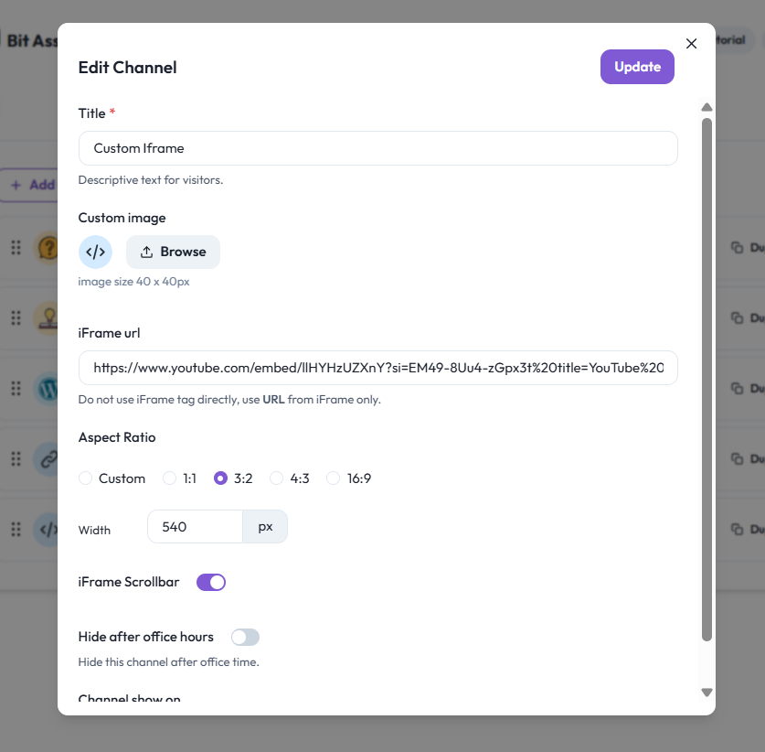 The custom iframe channel takes integration further. It embeds websites, YouTube videos, or a location inside your widget. You just need to add the URL. Visitors can interact without leaving your page.