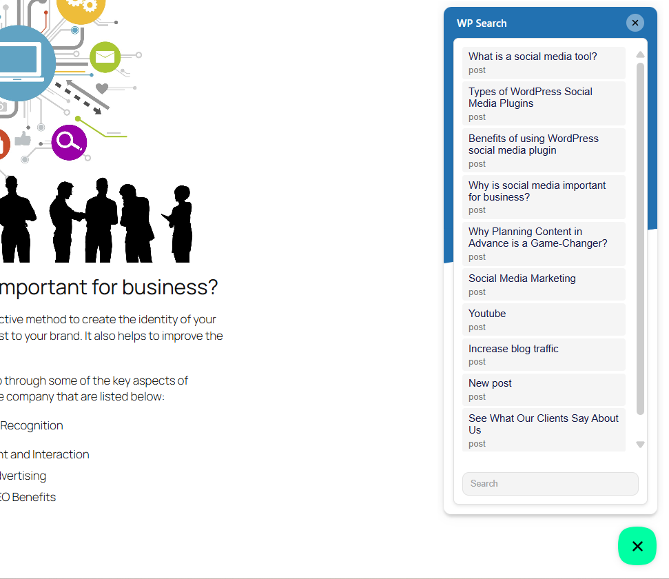 Blogging Site. A blogging site can add a WP Search button and a knowledge base. This way, readers can find related articles easily. They discover more content without leaving the page. Bounce rate decreases and time spent on site increases significantly.